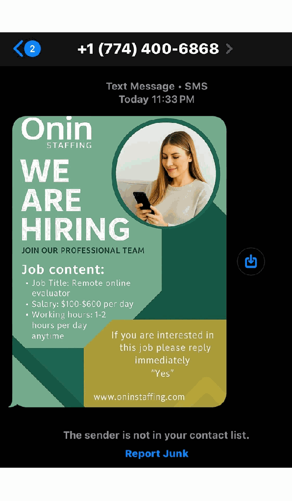 Several members of our team have received the almost exact same job offer scam texts. The content of the messages is almost identical, but there is a variation in background images.